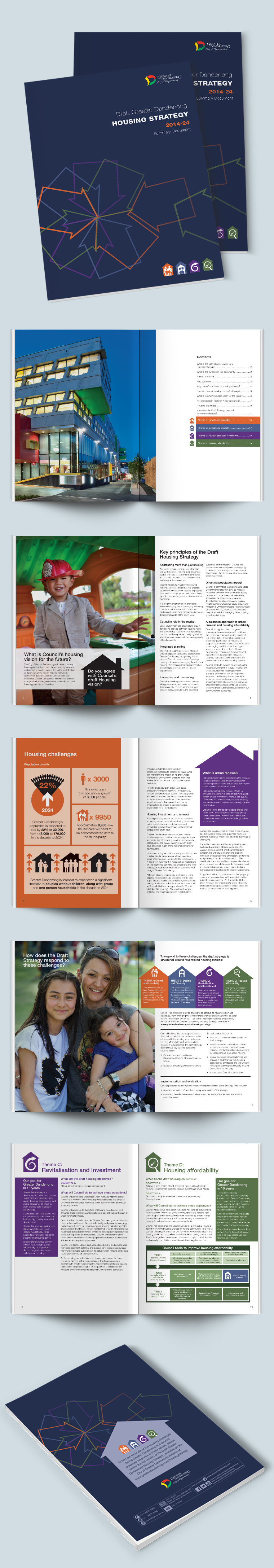 The Greater Dandenong Housing Strategy 2014-24 provides Greater Dandenong with the policy framework and direction to plan for the sustainable supply of housing. This will ensure the current and future housing needs of Greater Dandenong residents are met. Think approached this job as a branding project & report as there were several themes and infographics within the document.
